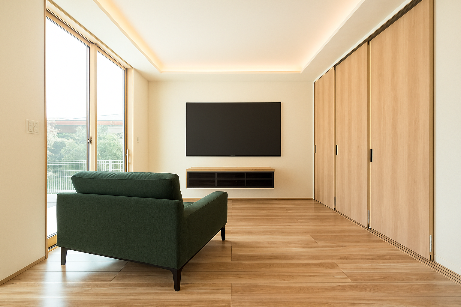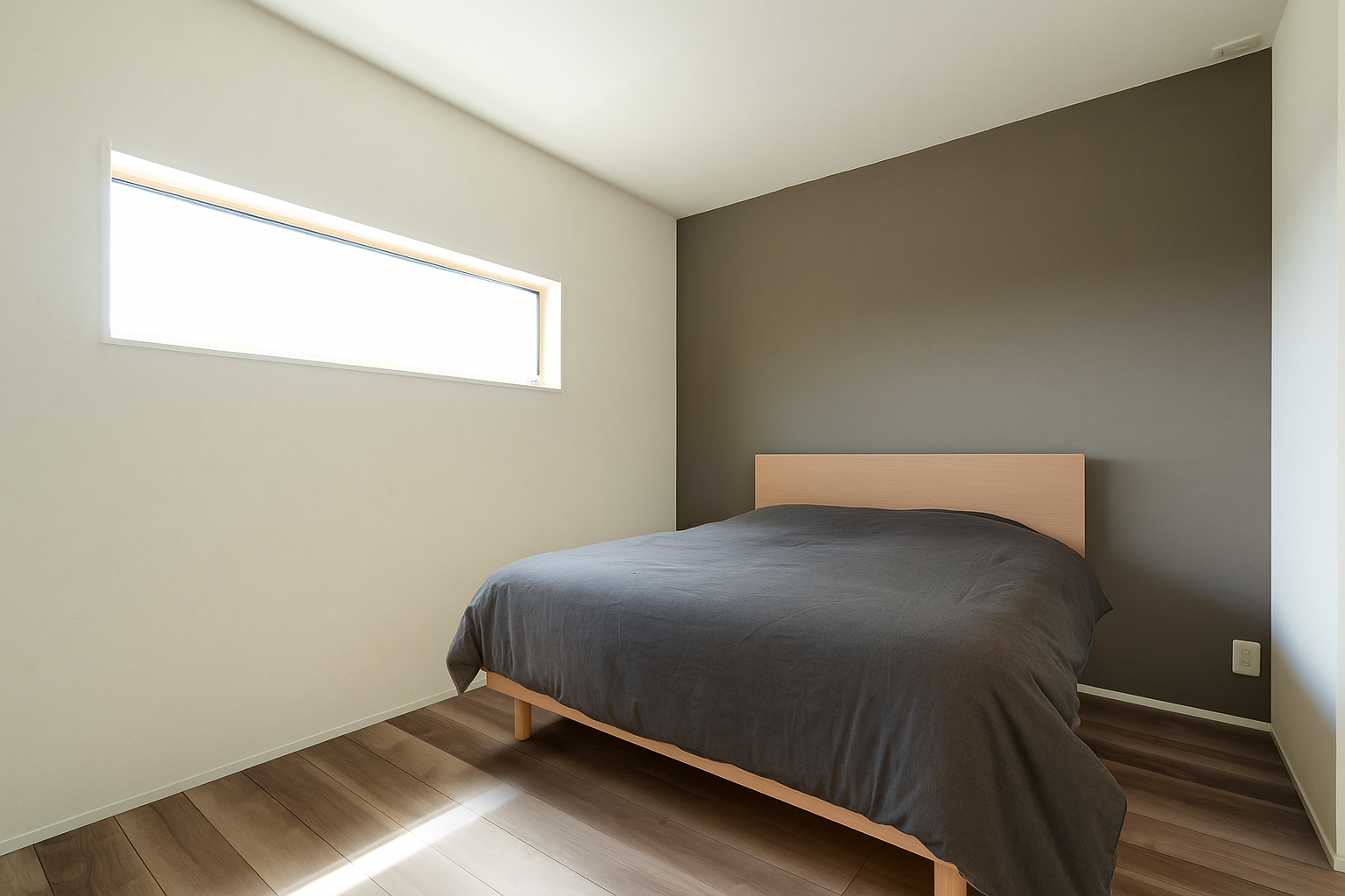 落ち着いた床の色とアクセントクロスを採用した寝室!